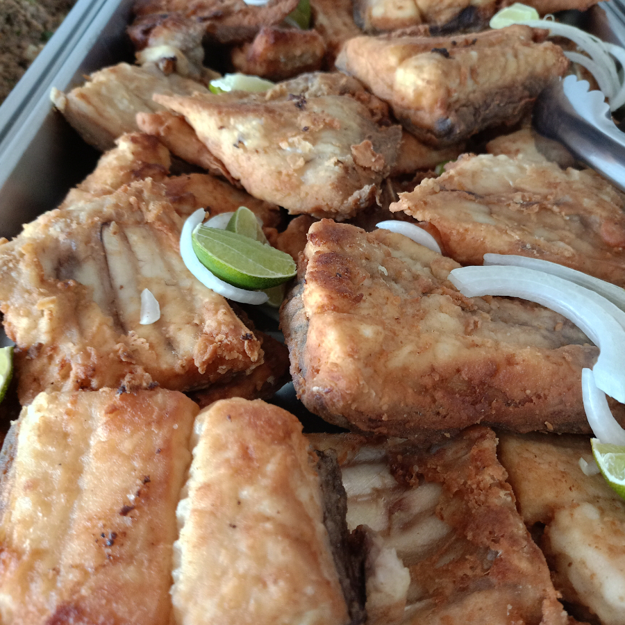 Peixe frito sem espinha ,Arroz, Feijão, Macarrão, Farofa e Salada