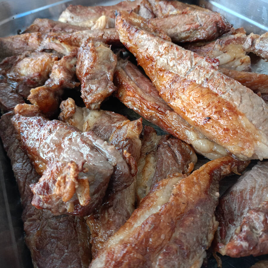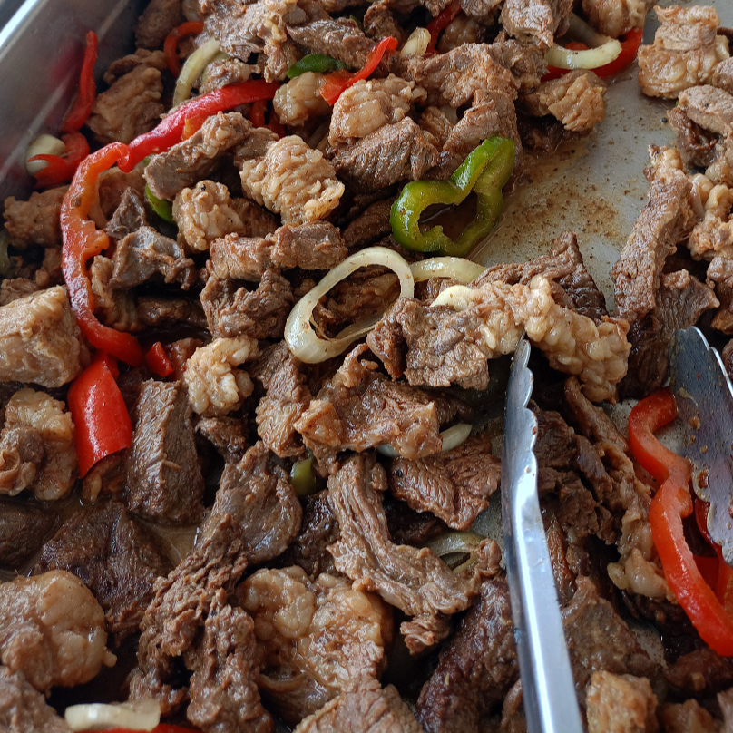 Carne na Chapa, Arroz, Feijão, Macarrão, Farofa e Salada