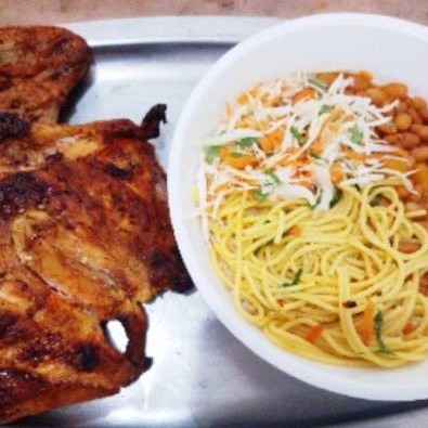 feijao, arroz, macarrao salada crua e farofa