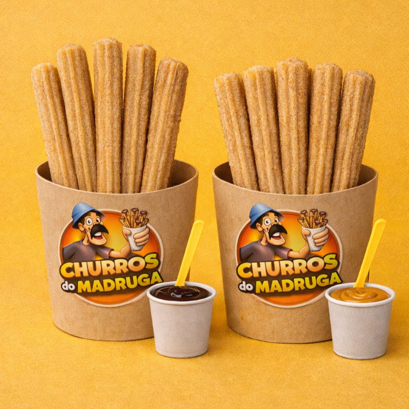 Desfrute de 5 churros espanhóis acompanhados de 2 copinhos de doce à sua escolha. Uma delícia que traz o sabor da Espanha até você.