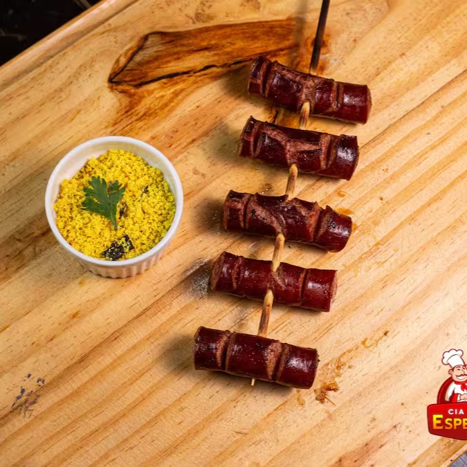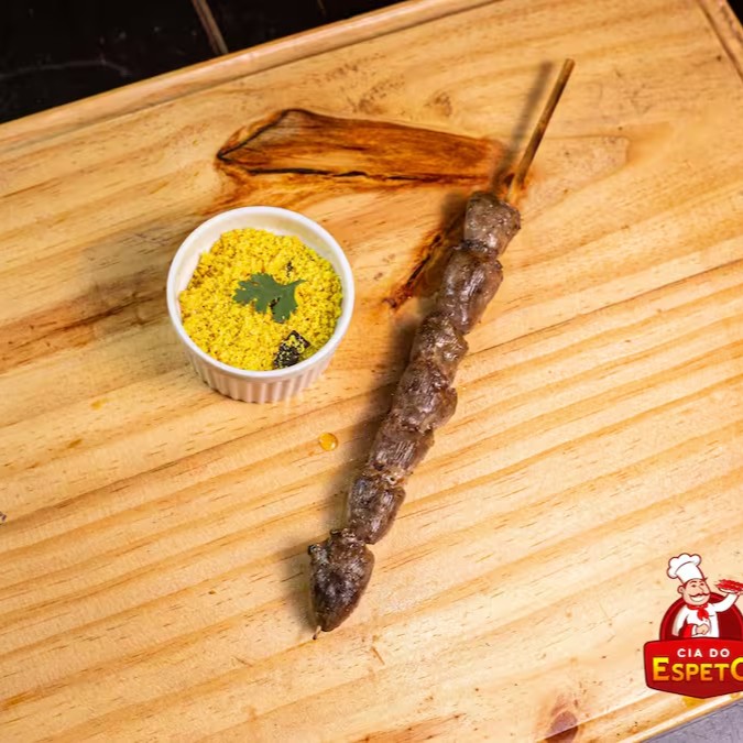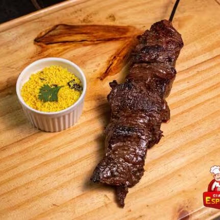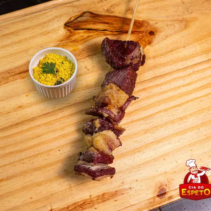 Espeto carne de charque, acompanha farofa e molho de alho.