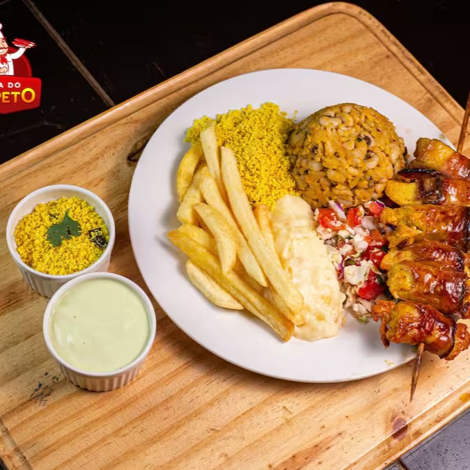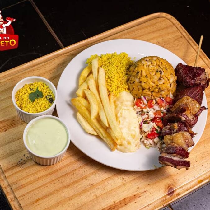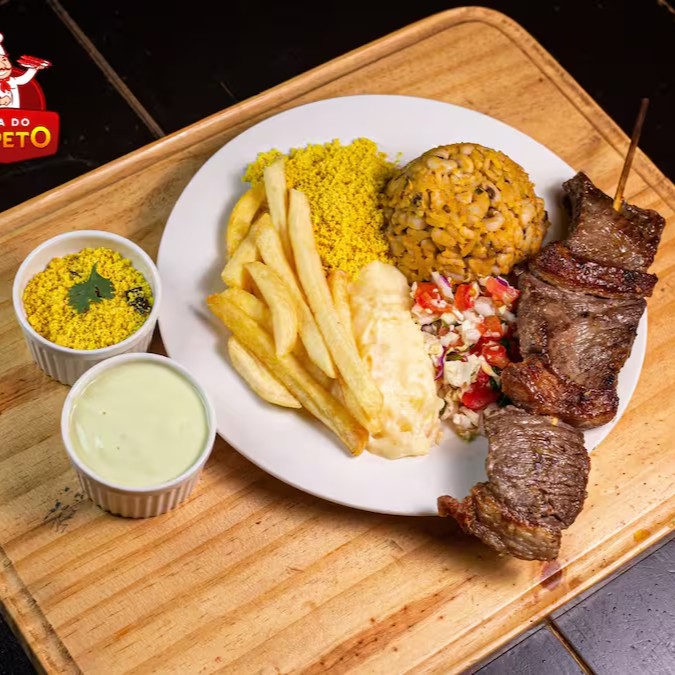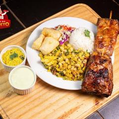 Espeto de alcatra, prato individual, escolha sua opção de acompanhamento.