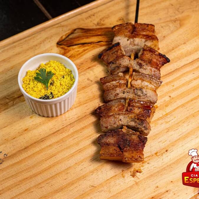 Espeto de Panceta Suína, prato individual, escolha sua opção de acompanhamento.
