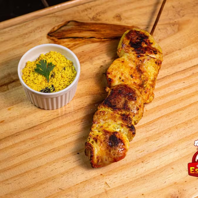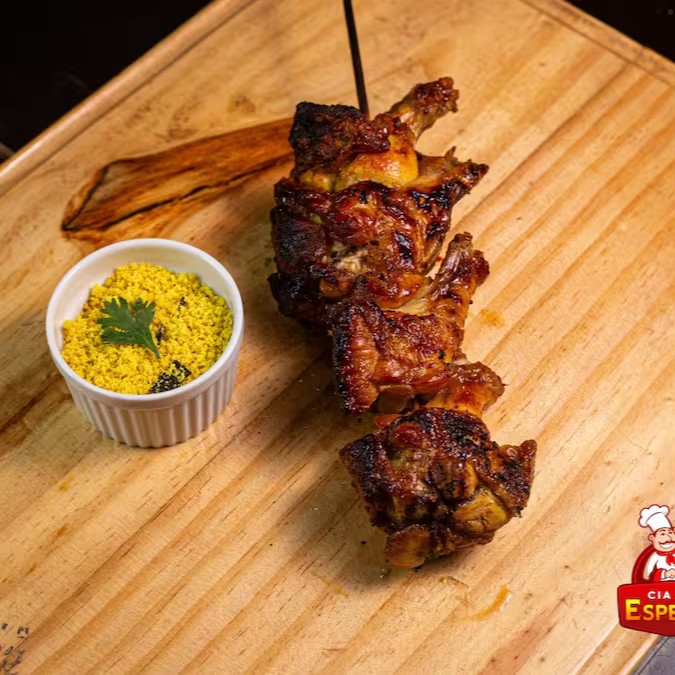 Fíle de Frango espeto, acompanha molho de alho e farofa