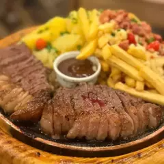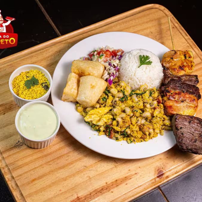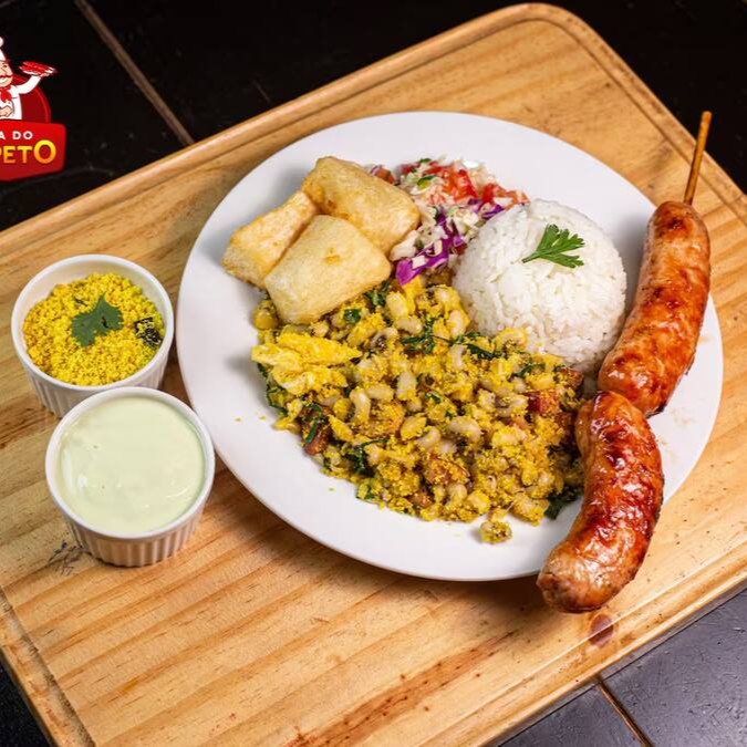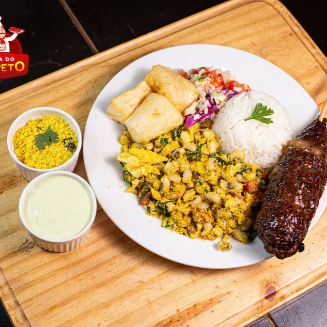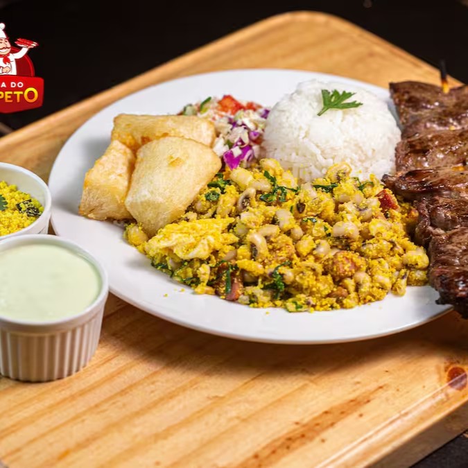 (400g) de picanha maturada feita na churrasqueira, acompanhada de macaxeira cozida na manteiga de garrafa (200g), mais batata frita com queijo e bacon (200g) + vinagrete e farofa + (200g) Arroz branco ao alho + (200g) Feijão Tropeiro