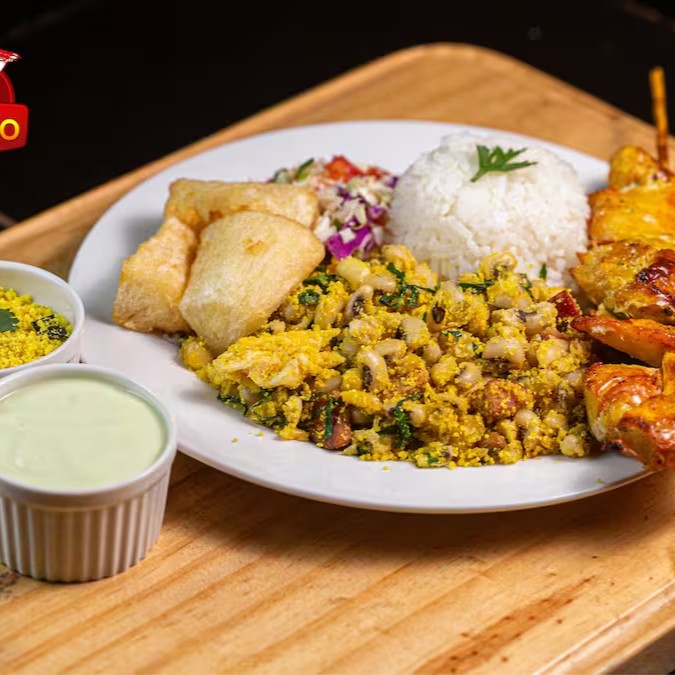 Delicioso espeto de Língua bovina. Para acompanhar, oferecemos uma variedade de opções à sua escolha, já incluso a farofa e molho de alho
