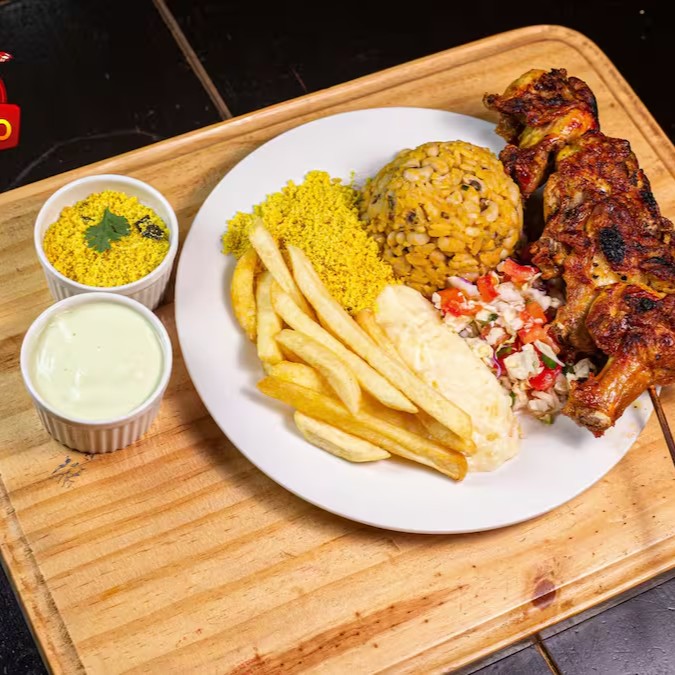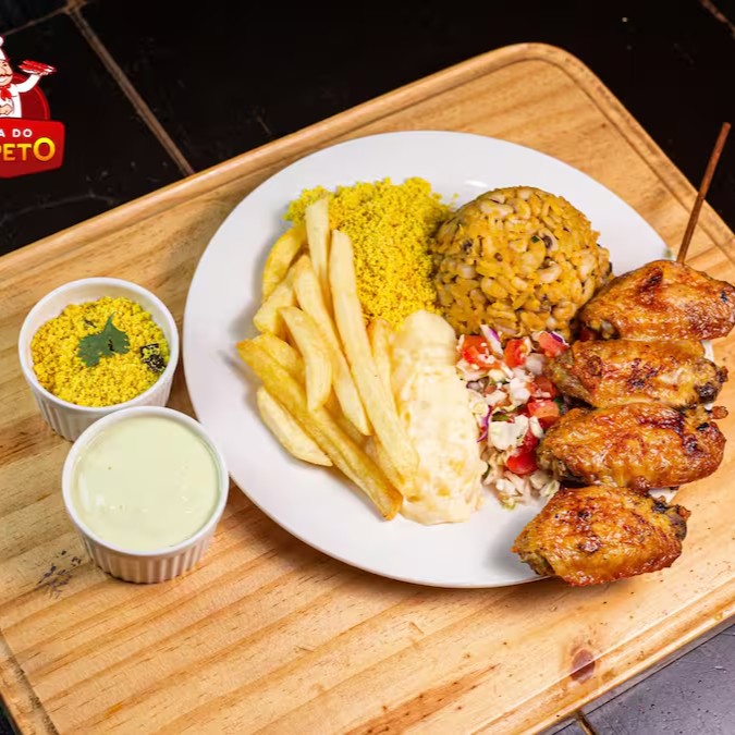 Espeto de meio da asa,prato individual,escolha sua opção de acompanhamento.