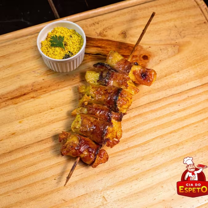 Espeto de Filé de Frango enrolado no bacon, acompanha farofa e molho de alho