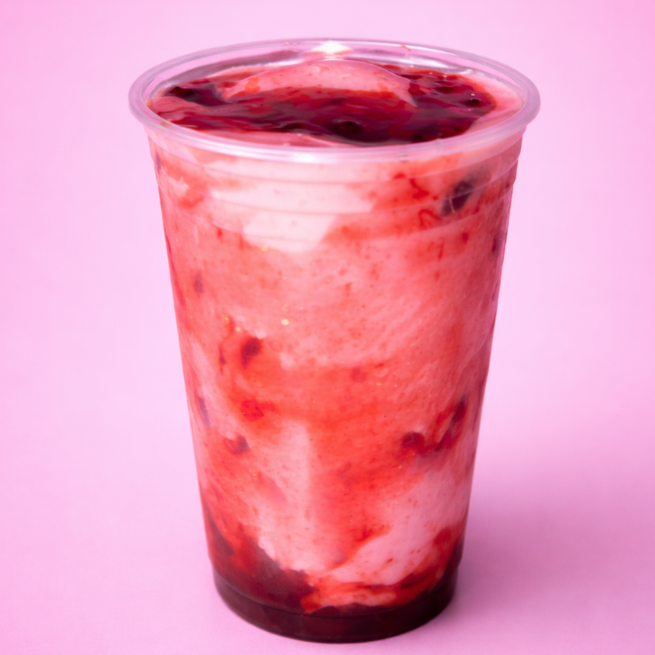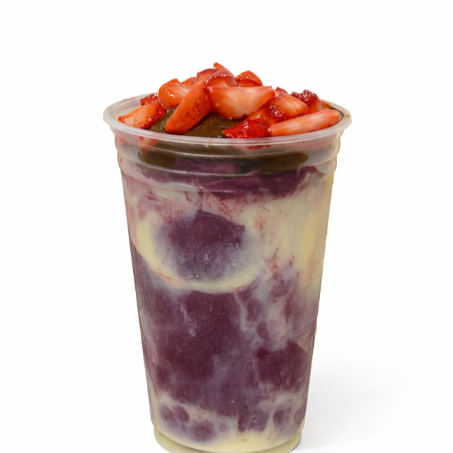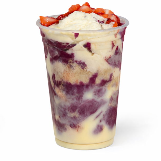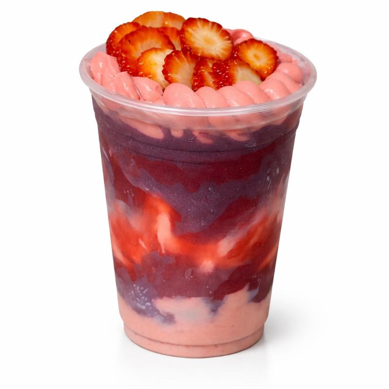 Açaí. Morango. Creme de morango. Cobertura de morango.