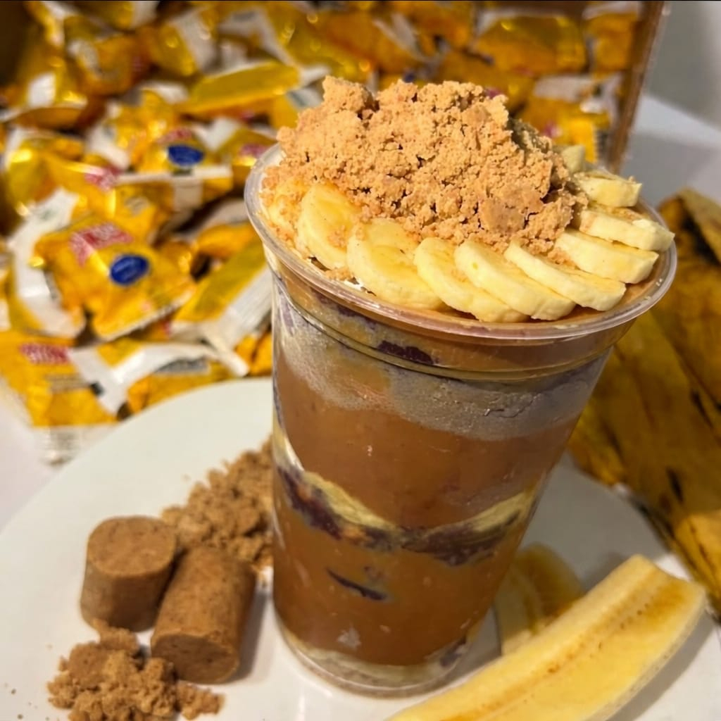 Fruta: Banana. Calda: Caramelo. Acompanhamentos: Paçoca, Doce de leite e biscoito