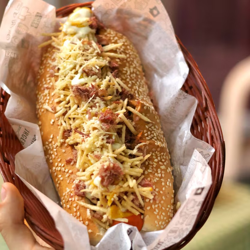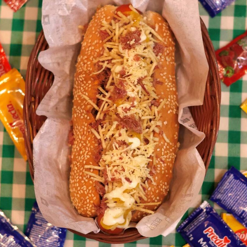 Pão 20cm, carne moída, salada de repolho e cenoura, duas salsichas, charque cozido e desfiado, molho artesanal de alho, molho artesanal de bacon, batata palha, finalizado com mostarda.