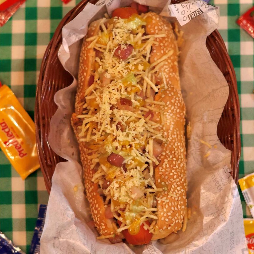 Pão 20cm, carne moída, salada de repolho e cenoura, duas salsichas, cubos de Calabresa, molho artesanal de alho, molho artesanal de bacon, batata palha, finalizado com molho cheddar.
