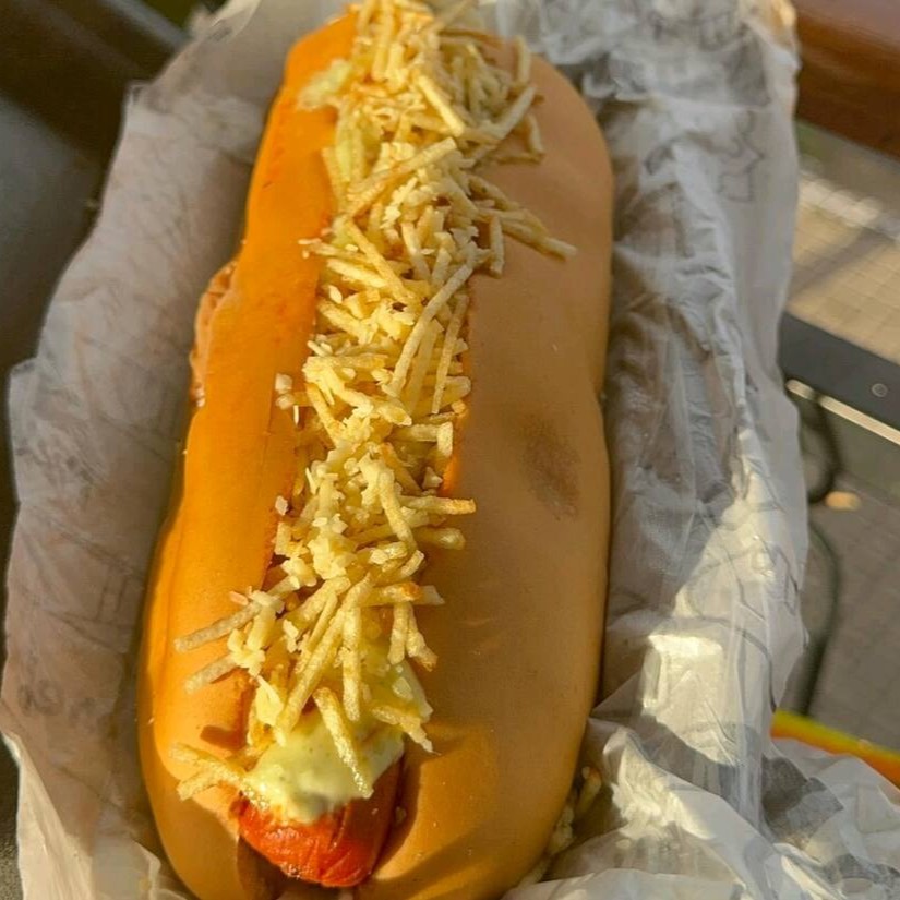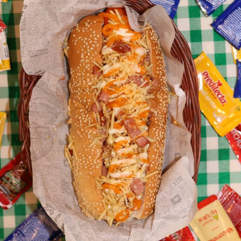 Pão 20cm, patê de frango, salada de repolho e cenoura, duas salsichas, cubos de bacon, molho artesanal de alho, molho artesanal de bacon, batata palha, finalizado com mostarda.
