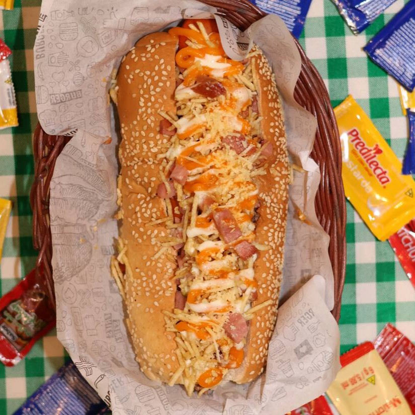 Pão 20cm, patê de frango, salada de repolho e cenoura, duas salsichas, cubos de calabresa, molho artesanal de alho, molho artesanal de bacon, batata palha, finalizado com molho cheddar.