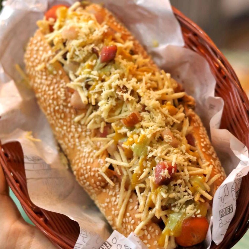 Pão 20cm, carne moída, salada de repolho e cenoura, duas salsichas, cubos de bacon, molho artesanal de alho, molho artesanal de bacon, batata palha, finalizado com mostarda.