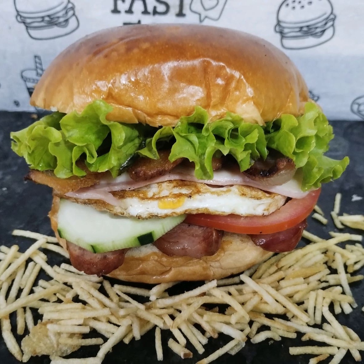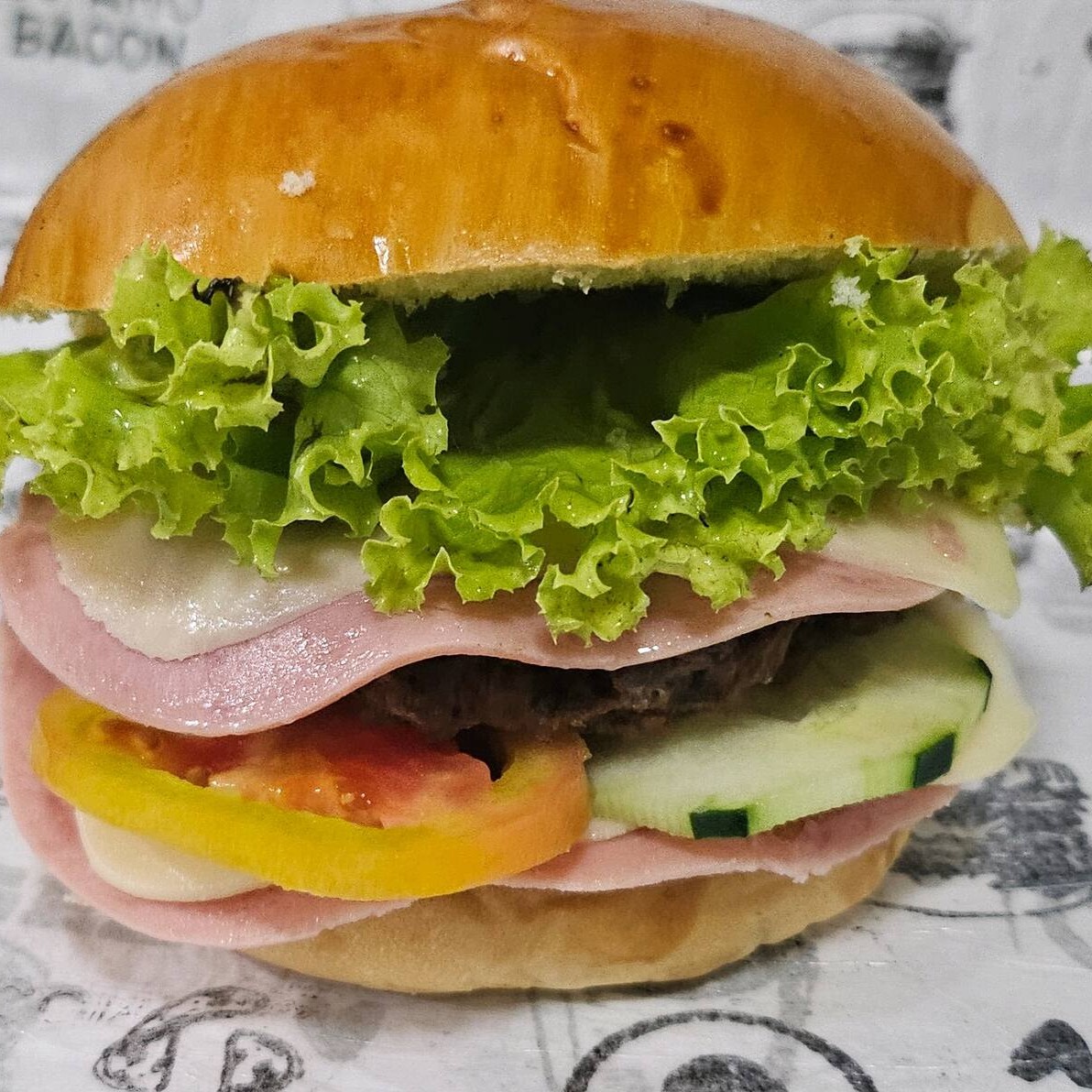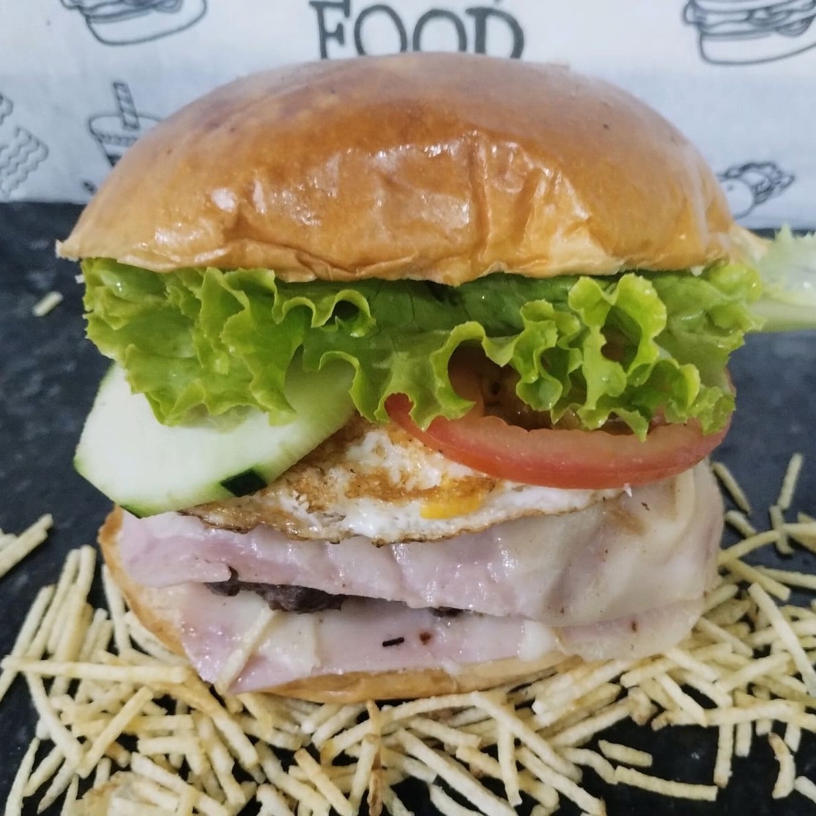 Pão, carne,120gm queijo, presunto,salada,batata palha