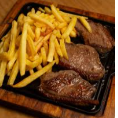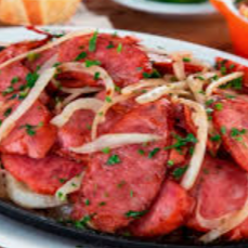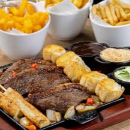 Picanha, Calabresa, Isca de Peixe, Filé de Frango, Macaxeira Frita ou Batata Frita, Salada, Baião e Farofa.