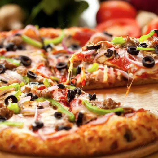 Mussarela, molho de tomate, azeitona, patê de frango, calabresa, tomate, cebola e orégano.