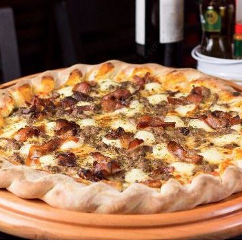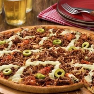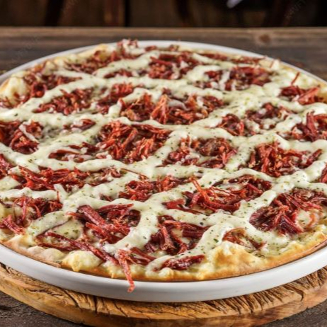 Mussarela, molho de tomate, azeitona, charque, cream cheese, cebola, pimenta biquinho e cebolinha.