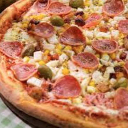 Mussarela, molho de tomate, frango desfiado, catupiry, milho, azeitona e orégano