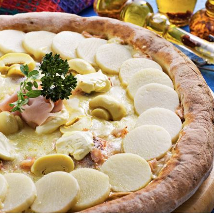 Mussarela, molho de tomate, palmito, milho, tomate, cebola e orégano