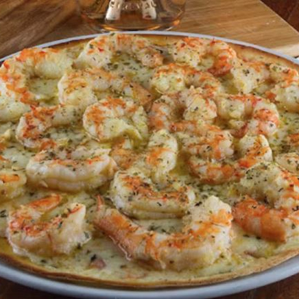 Mussarela, molho de tomate, camarão rosa, tomate e orégano