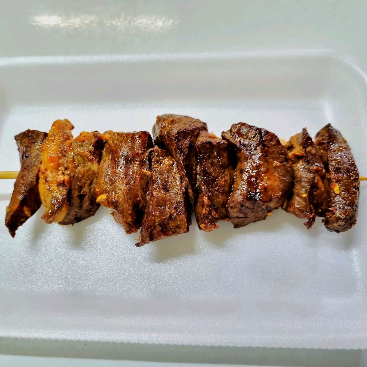 Espetinho de coração de boi, macio e saboroso, servido com farofa especial.