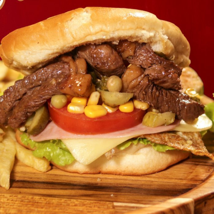 Pão bola, carne de hambúrguer, carne picanha em pedaços, ovo, presunto, queijo, salada, e batata palha. (Imagem ilustrativa)