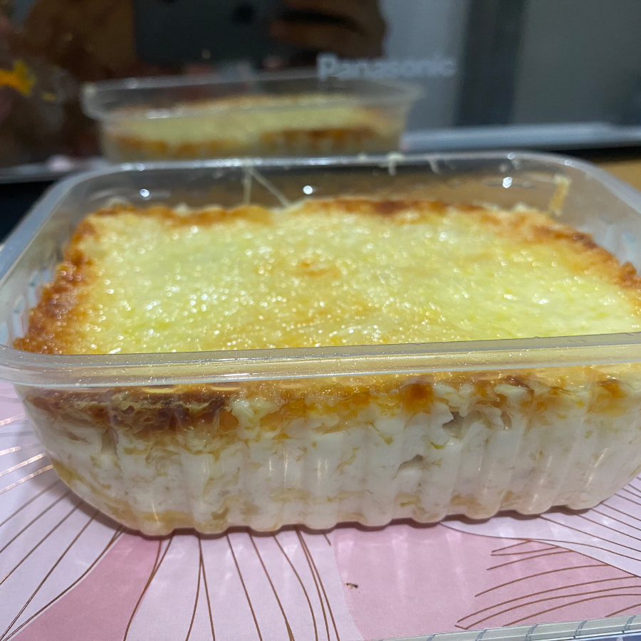 Carne cremosa com uma camada de purê por cima gratinado e acompanha arroz