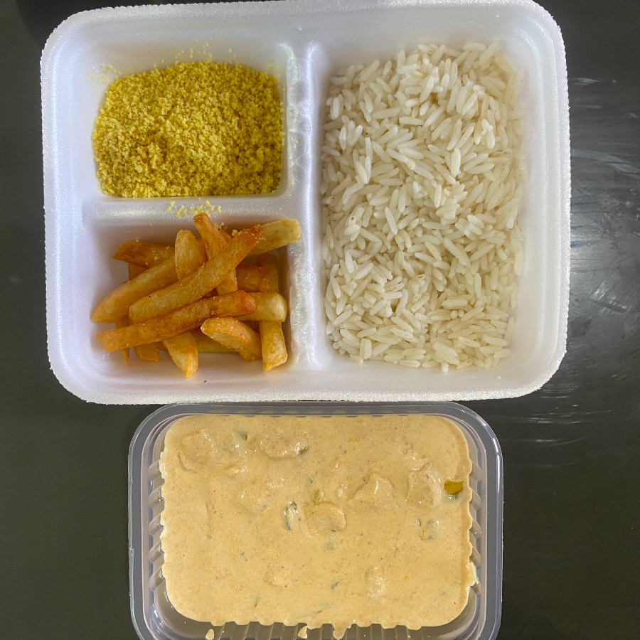 Strogonoff, acompanhamento arroz, farofa e batata frita