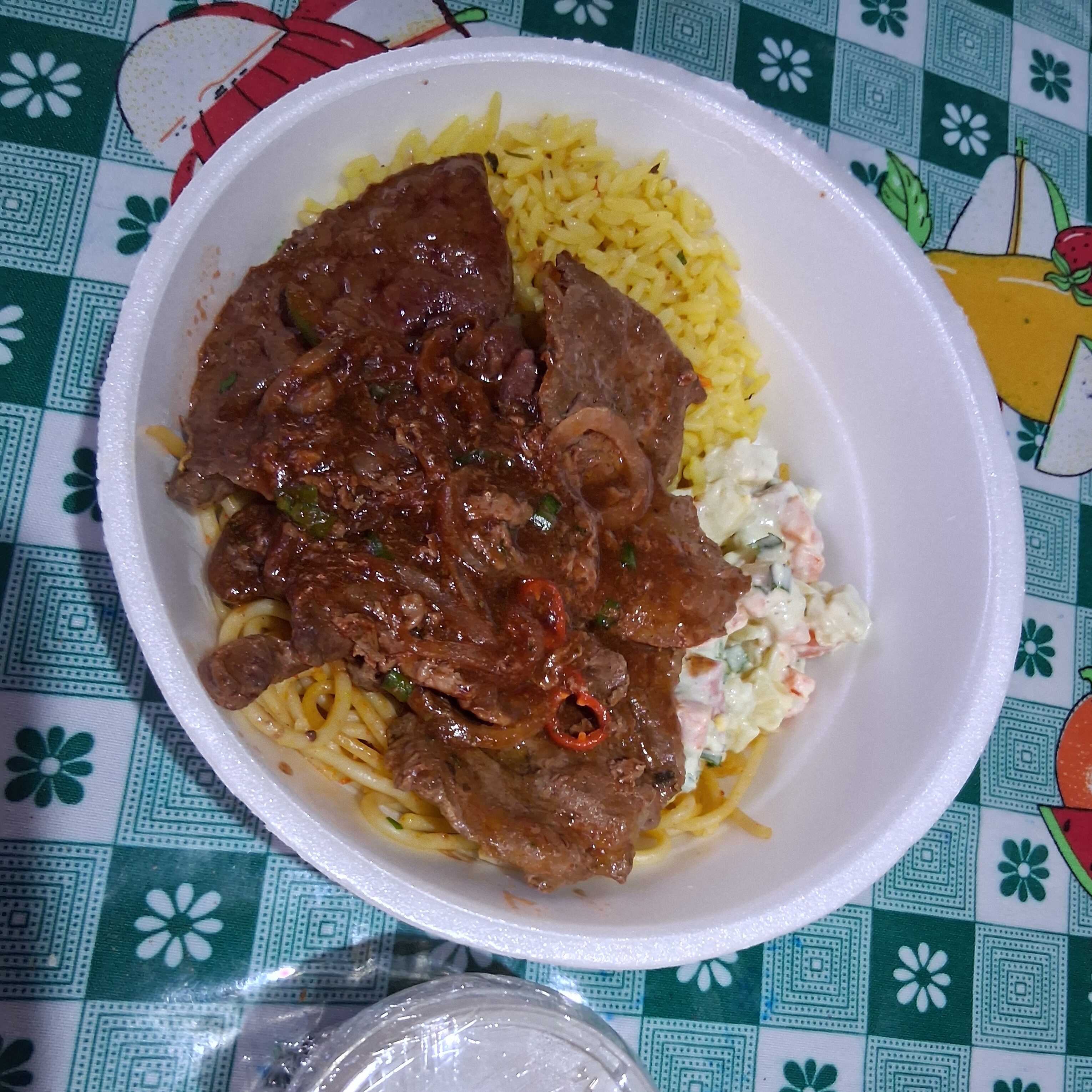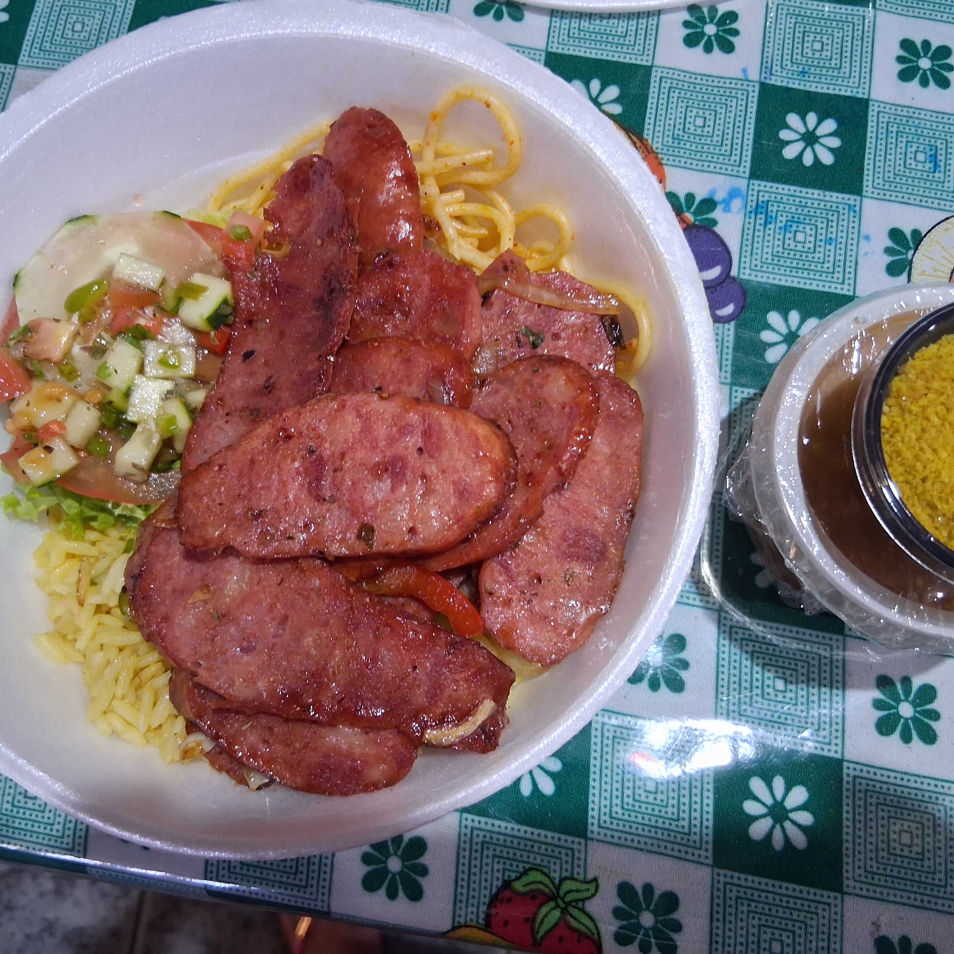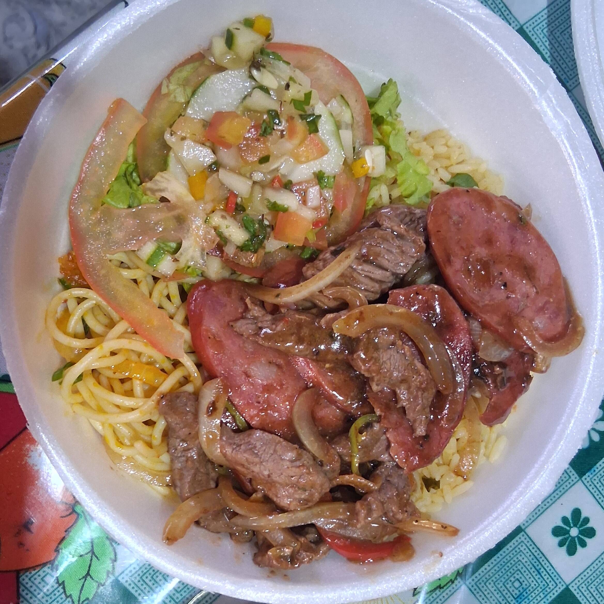 Arroz, macarrão, feijao, farofa e salada