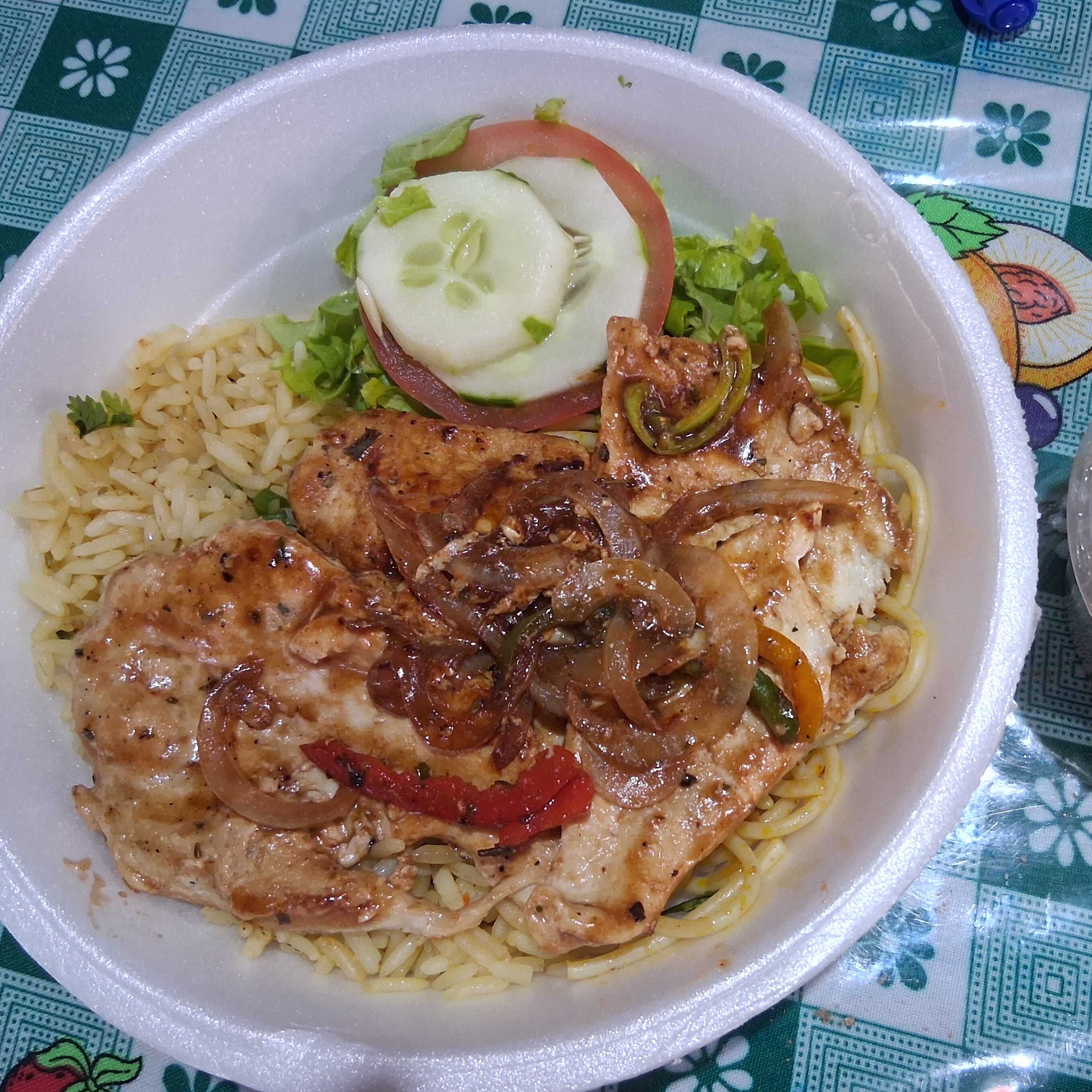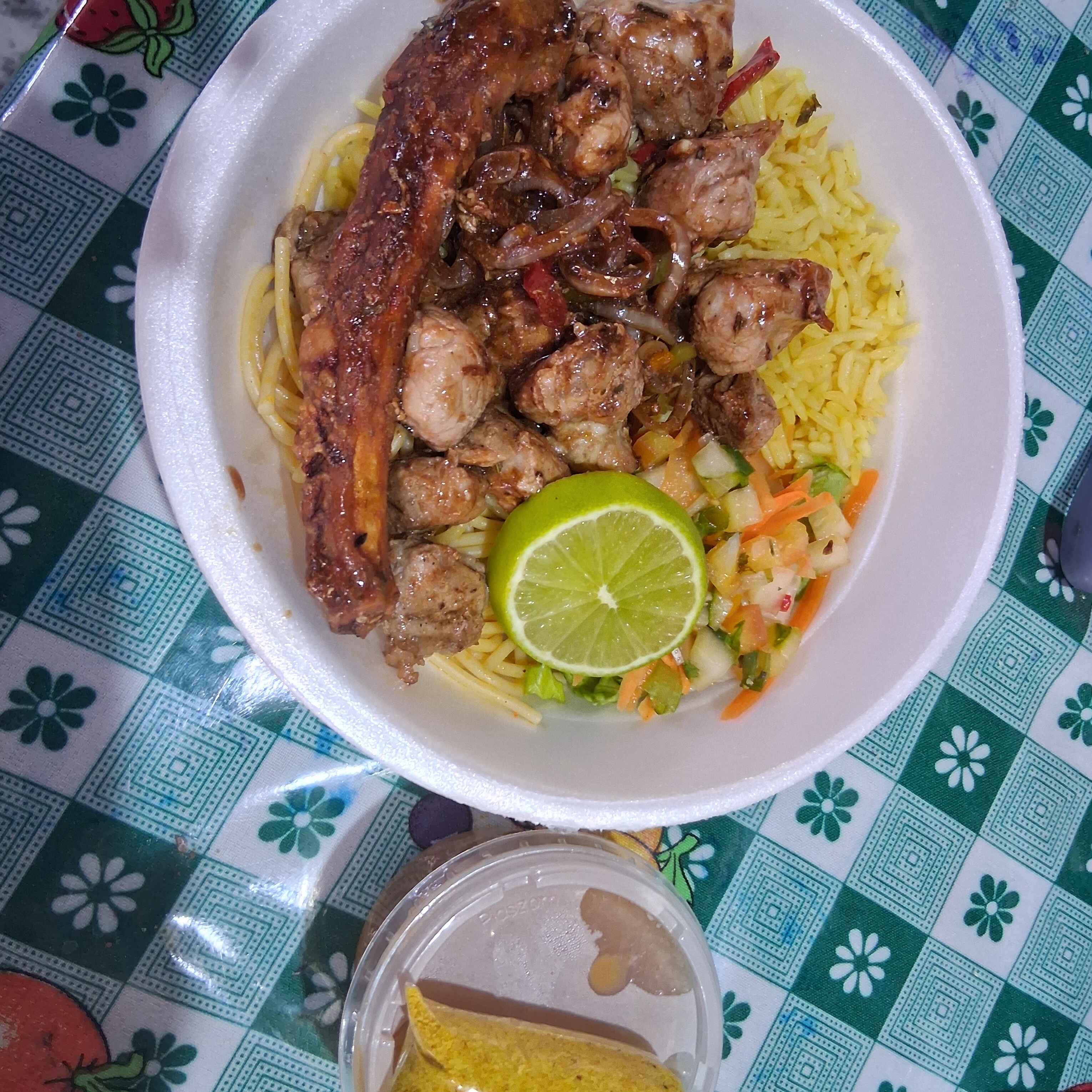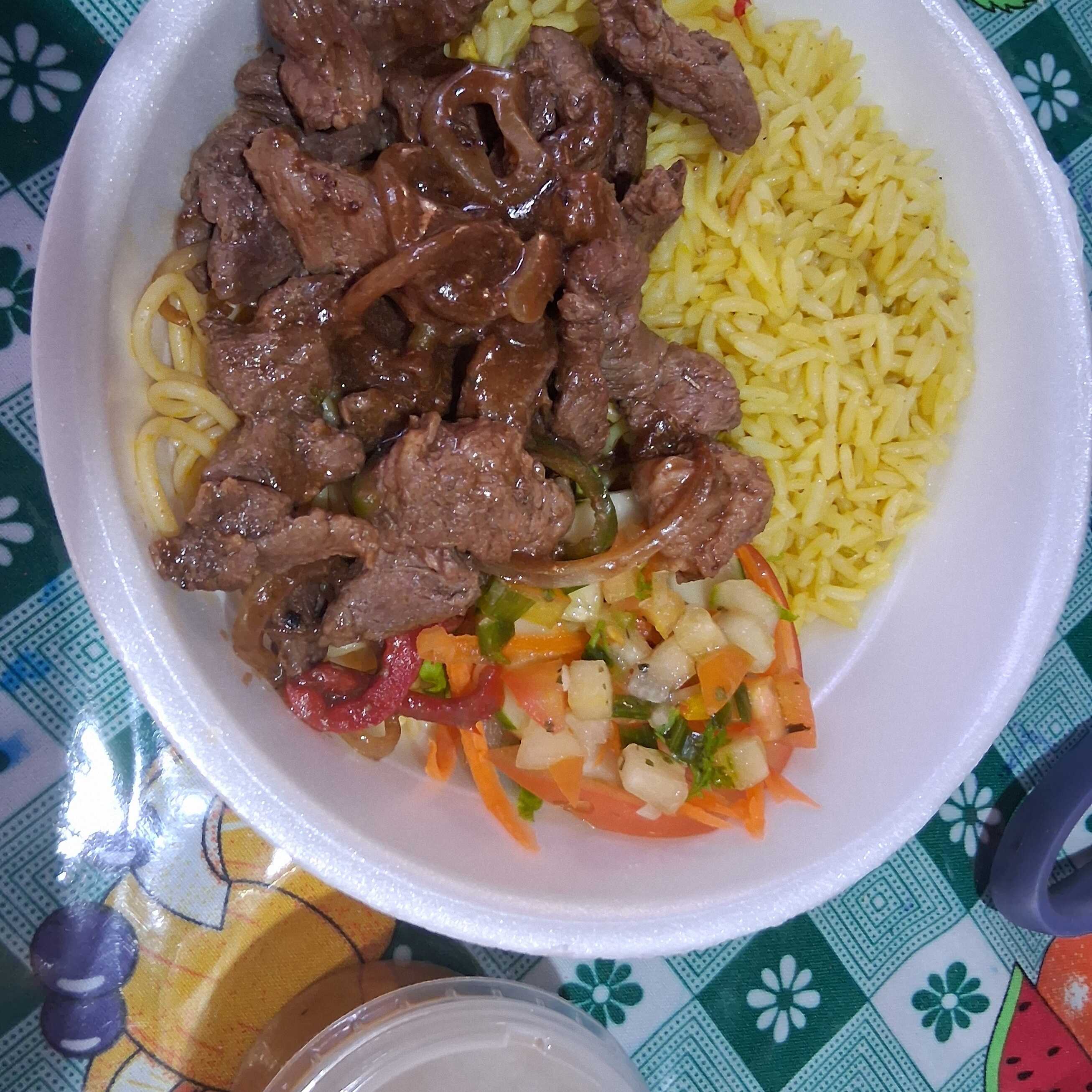 Arroz, macarrão, feijao, farofa e salada