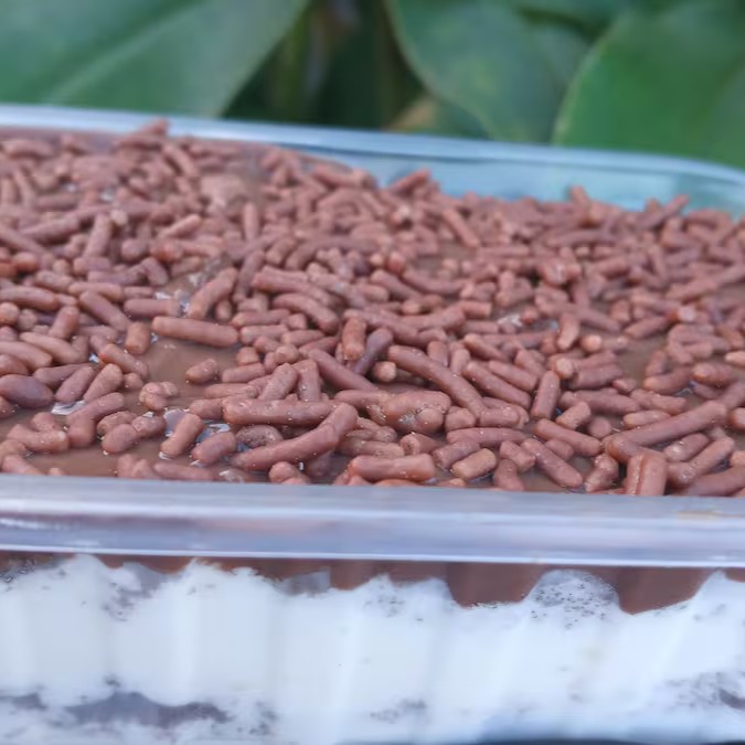 Deliciosa camada de creme de Ninho, camada de bolo 50 %cacau, finalizado com uma camada de creme de chocolate com granulado por cima.