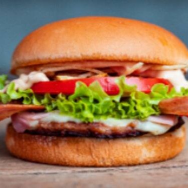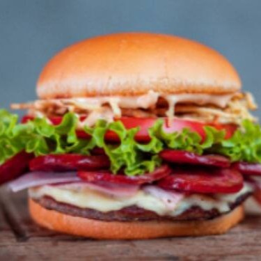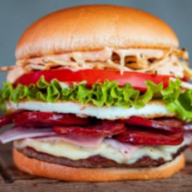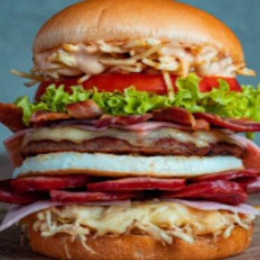 Carne, bacon, ovo, presunto, mussarela, batata palha e salada.