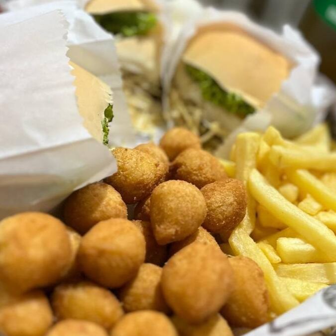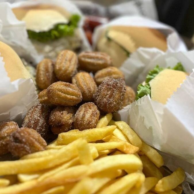 4 burguers,porção de mini churros, porção de batata e 1 coca 1L