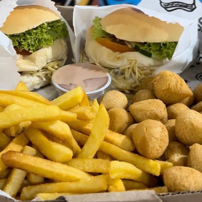 2 burguers, 1 porção de batata, 1 porçâo de mini coxinha e guarana de 1L