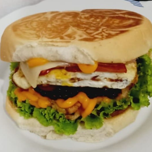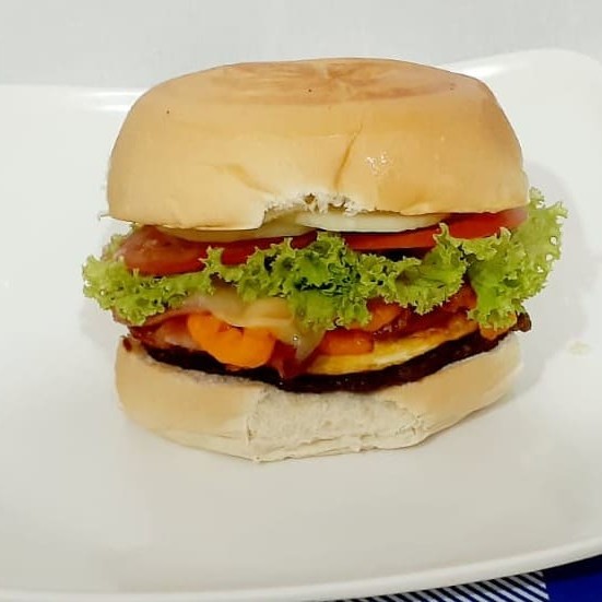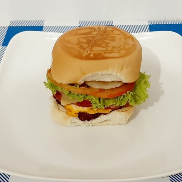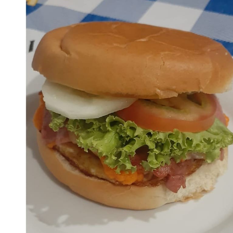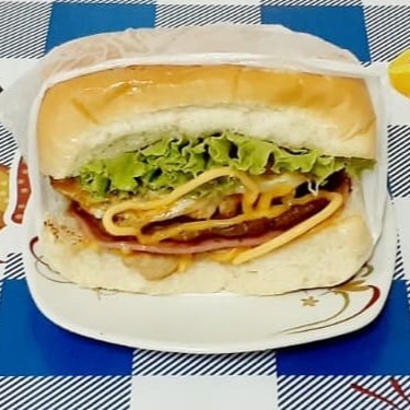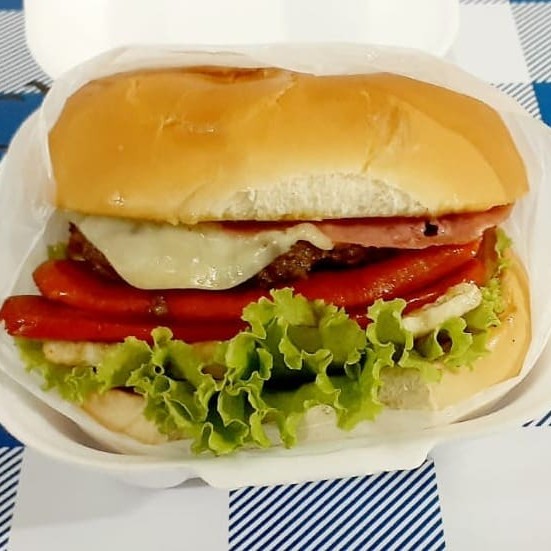 Pão bola, 2 carnes (70g), queijo, apresutanto, 2 ovos, calabresa, salsicha e salada (alface, pepino e tomate)