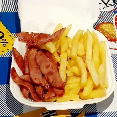 Pão bola, carne (70g), queijo, apresuntado, ovo, calabresa, salsicha, cheddar, batata palha e salada (alface, pepino e tomate)