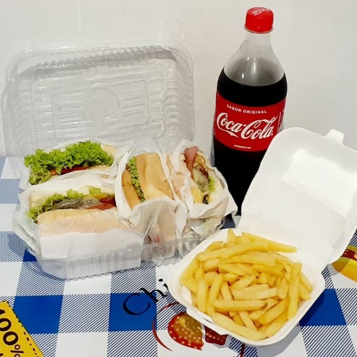 03 burger especial + 01 coca cola 1l + batata frita + petiscos (carne + frango + calabresa) + 03 sobremesas
