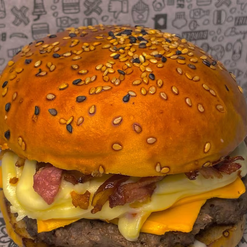 Pão brioche, 3 blends 130g, queijo prato, bacon, calabresa e cebola crispy