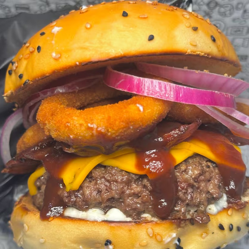 Pão gergelim, cebola empanada, 130g de carne, barbecue, cheddar e bacon