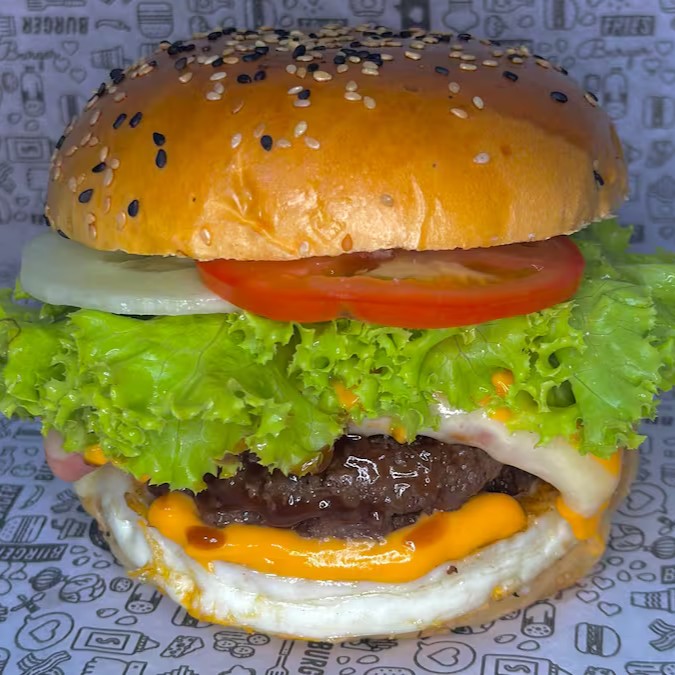 Pão , carne 130g, calabresa, ovo, queijo cheddar, tomate e molho da casa.