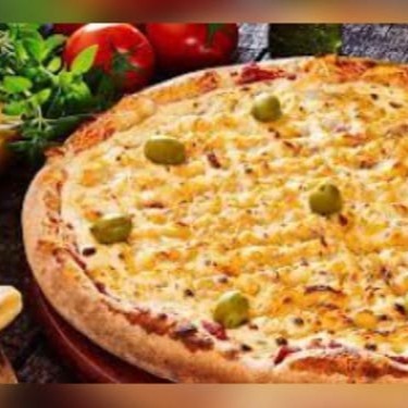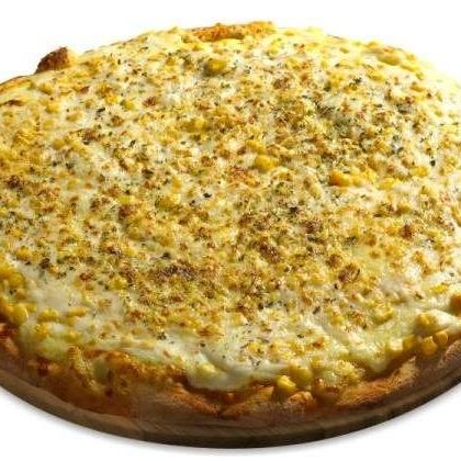 Mussarela, molho de tomate, frango desfiado, catupiry, milho, azeitona e orégano.
