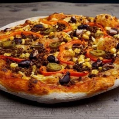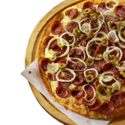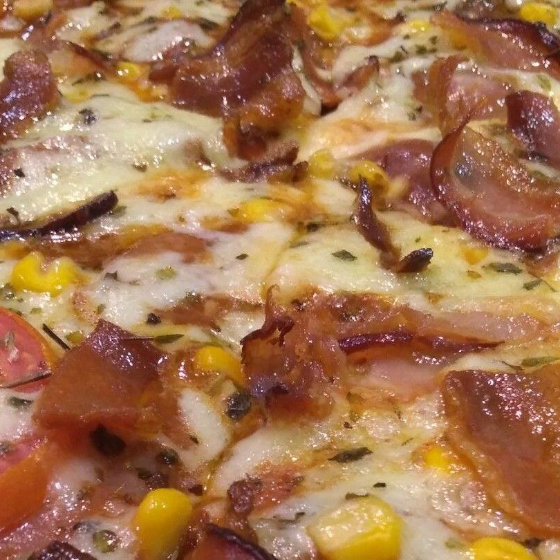 Mussarela, molho de tomate, azeitona, bacon, calabresa, frango, cebola e orégano.