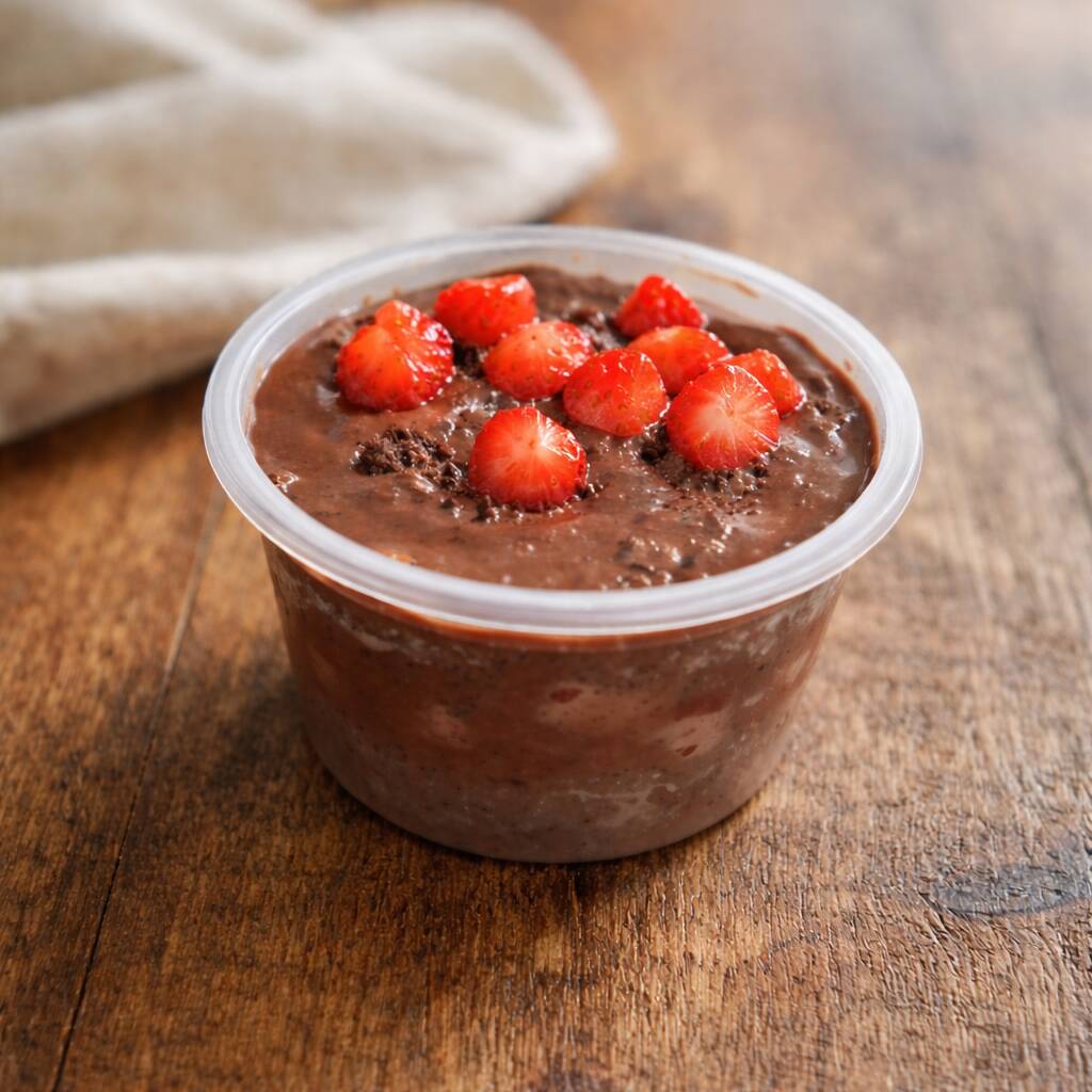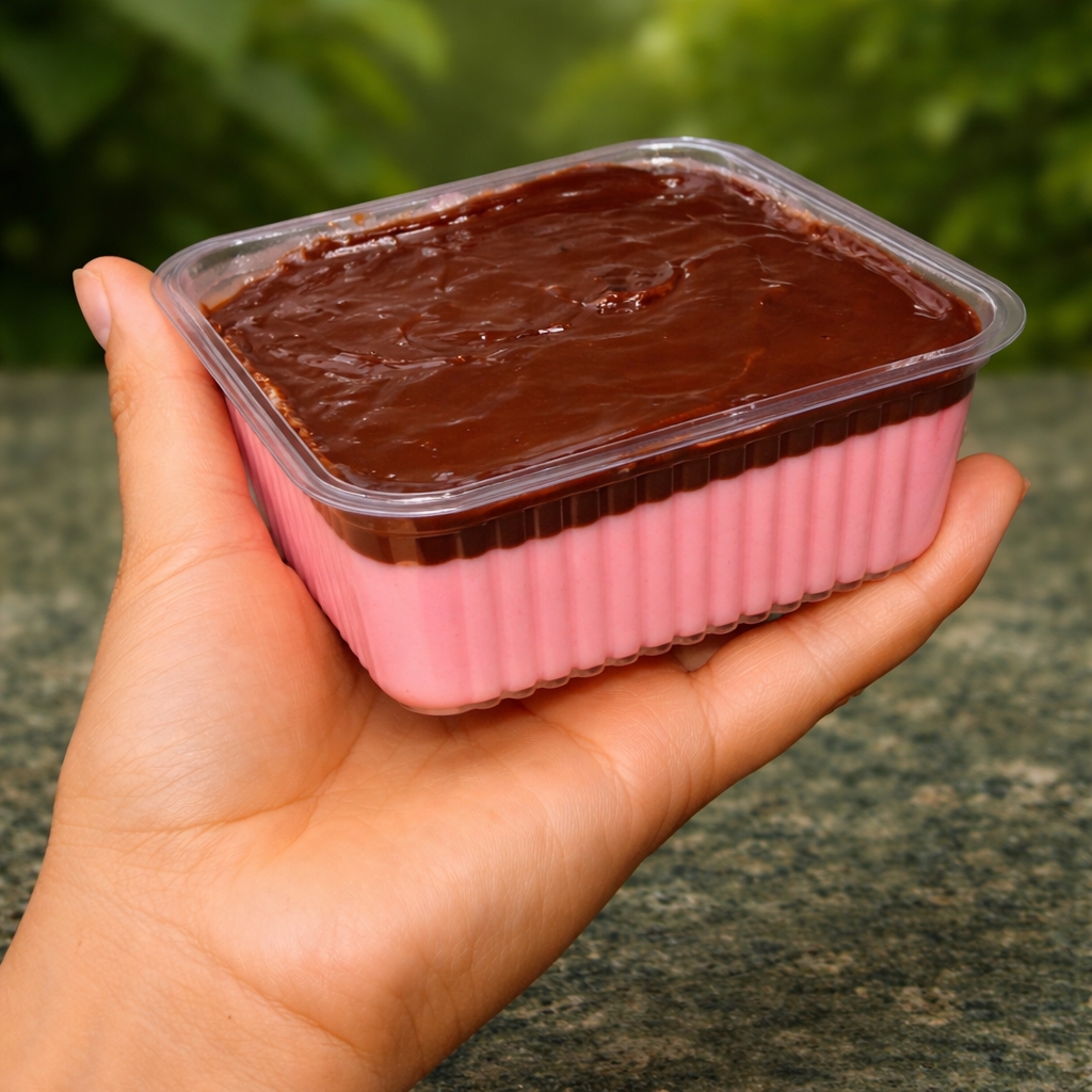 Mousse de morango no pote de 200ml com uma camada de chocolate para finalizar