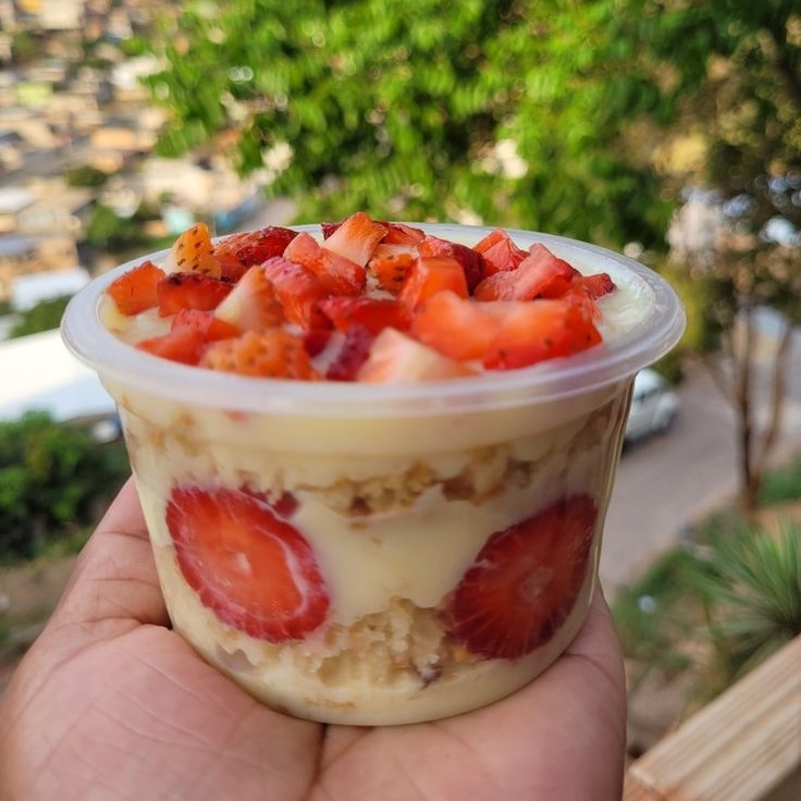 Bolo no pote de morango com Ninho: camadas de bolo macio, creme de Ninho super cremoso e morangos frescos, formando uma combinação leve, doce e irresistível.