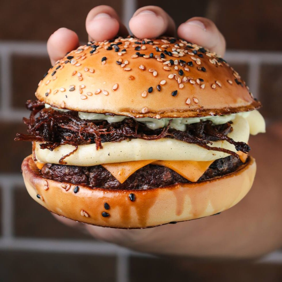 Delicie-se com nosso burguer do chefe, pão amanteigado com gergelim, um suculento blend de carne 180g assado na brasa, carne seca, Catupiry Original cremoso, queijo cheddar derretido e cebola roxa.