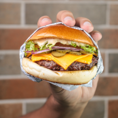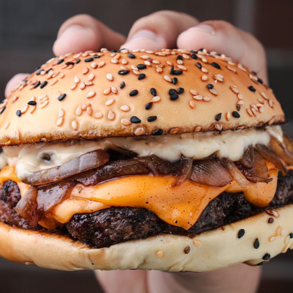 Experimente nosso irresistível Brasa: pão amanteigado, com um suculento blend de carne de 180g, queijo cheddar cremoso, cebola caramelizada e o inconfundível molho mac.