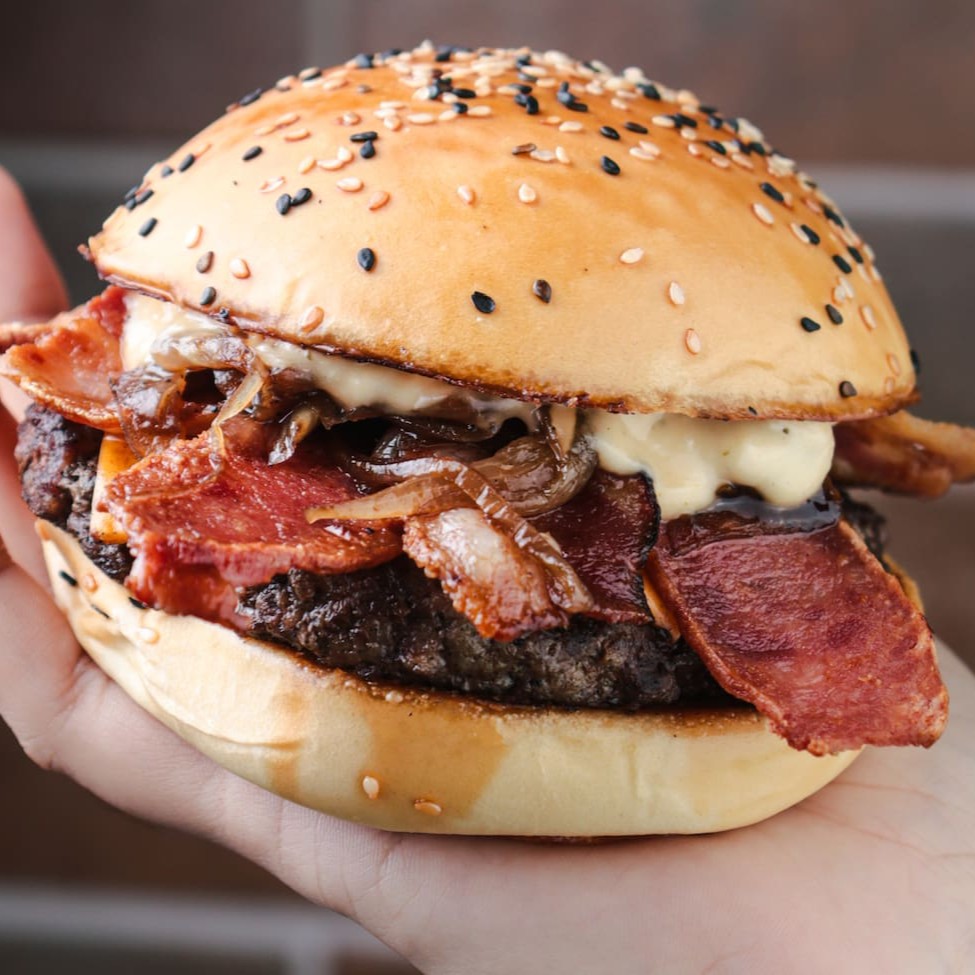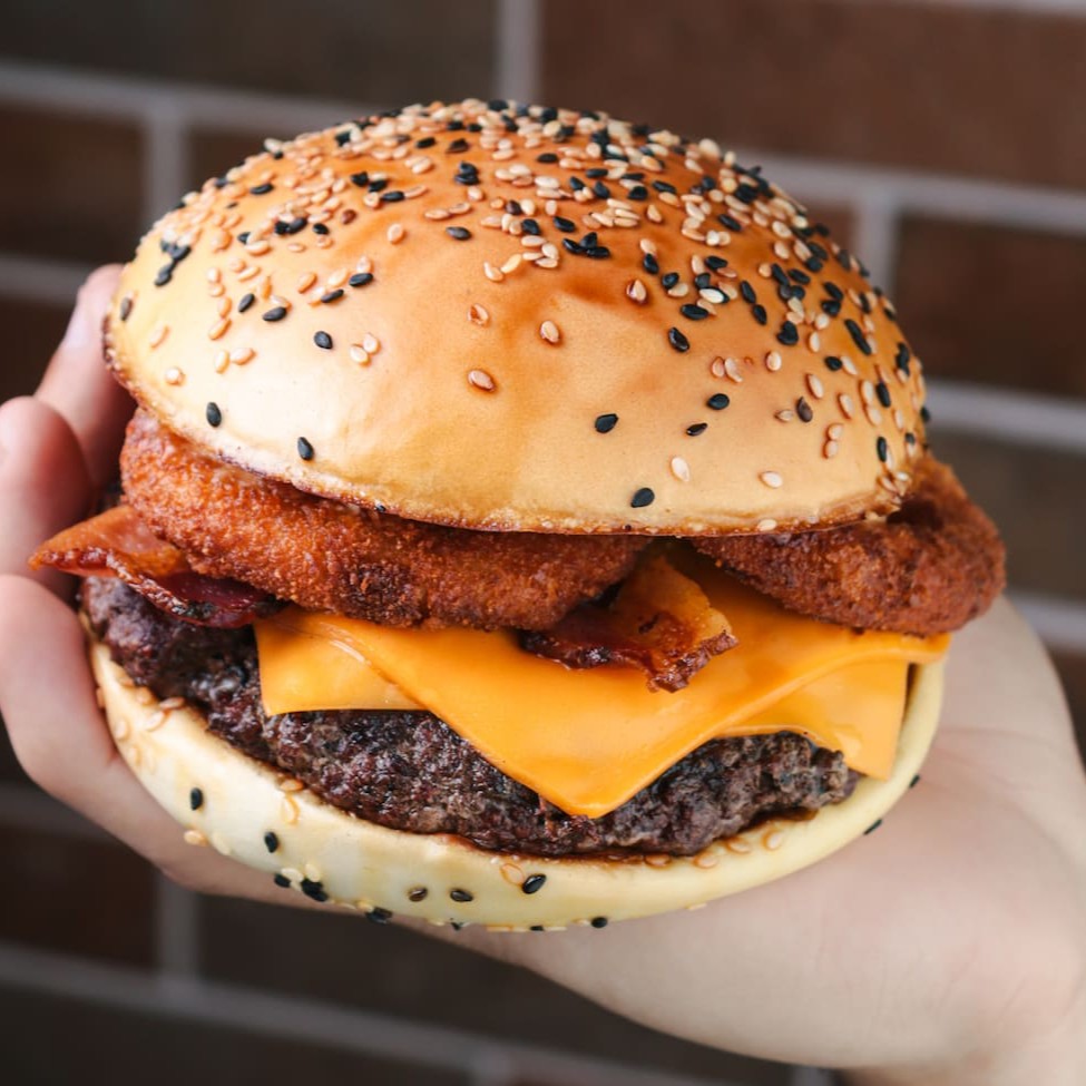 Experimente nosso irresistível Torreto: pão amanteigado com gergelim, blend de carne de 180g assado na brasa, queijo cheddar cremoso, crocantes anéis de cebola empanada, bacon crocante, finalizado com barbecue e maionese caipira.
