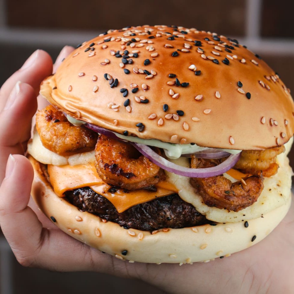 Delicie-se com nosso Royal Brasa, pão amanteigado com gergelim, um irresistível blend de carne de 180g assado na brasa, camarão rosa, Catupiry Original, queijo cheddar derretido e cebola roxa, tudo isto regado com nosso exclusivo molho mac!